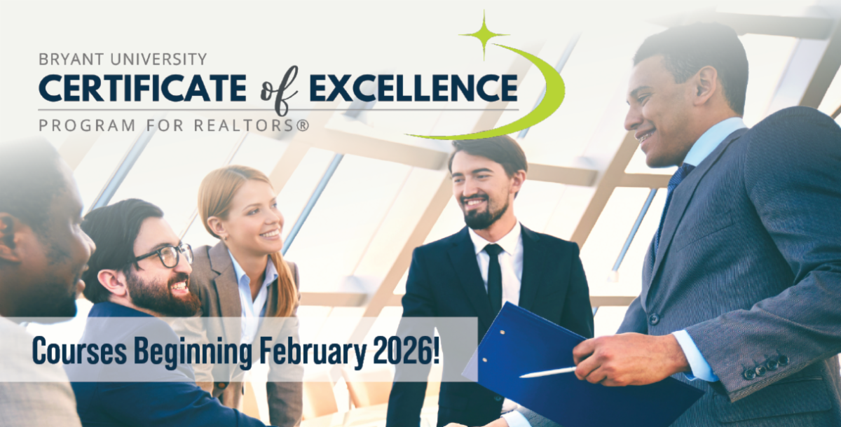 The Bryant University Certificate of Excellence Program will be offered in February 2026 through RI REALTORS and we will be holding an informal webinar on January 22nd with Bryant University, where they will share information and answer your questions about the upcoming program.