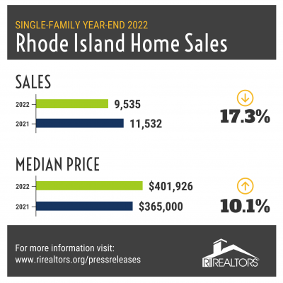 2022 overall saw a 17.3% decrease in single-family home sales compared to 2021 and a 10.1% gain in the median price. At $401,926, last year’s median price was the first time Rhode Island’s annual median price topped $400,000.