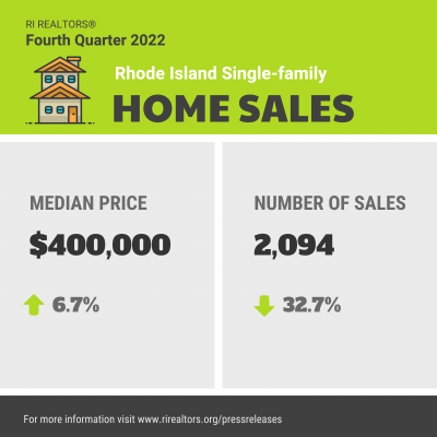 Warwick, R.I. – Feb. 1, 2023 – Home sales data recently released by the Rhode Island Association of Realtors relay a Q4 2022 median single-family home sales price of $400,000 which represented a 6.7% year-over-year gain, while the number of closed sales fell 32.7%. 2094 homes sold in the last three months of 2022 compared to 3113 in the fourth quarter of 2021.